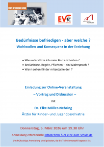 Dies hat auch mit dem zu tun, was viele Eltern unter „bedürfnisorientierter Erziehung“ verstehen. Eine Online-Veranstaltung mit Frau Dr. Elke Möller-Nehring, Ärztin für Kinder- und Jugendpsychiatrie, behandelt demnächst diese Thematik. Hier können Sie sich anmelden!